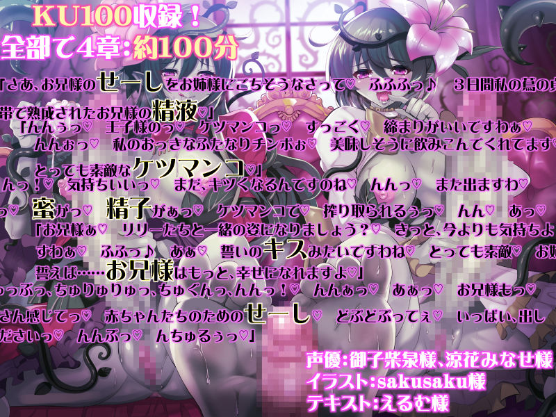 要素:逆アナル、ふたなり、TS、王子様、お姫様、お姉様、妹、アルラウネ、魔物娘、緊縛プレイ、精飲、KU100、バイノーラル